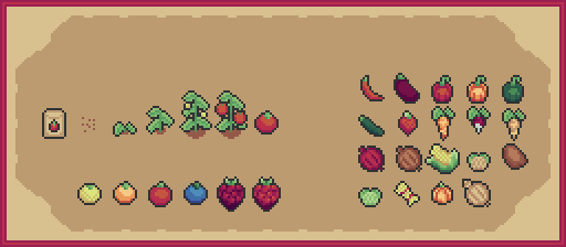 21 different crops with 4 unique growth stages, each come with seeds and an item icon. The crops included are :